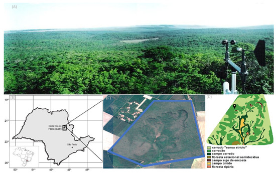 (A) View from the top of the micrometeorological tower at the PEG site, in the southeast direction, with a cup anemometer/wind vane on the right; (B) map of Brazil and São Paulo state with a location box of the site in the city of Santa Rita do Passa Quatro; (C) satellite image (07/2018) of the region with the PEG site (blue polygon); (D) vegetation physiognomy at the PEG site (adapted from [22]).