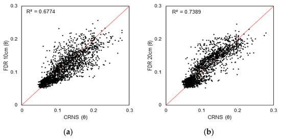 We noticed that the comparison of the CRNS sensor showed a strong correlation with the FDR sensor measurements at the shallower soil depths of 10 cm and 20 cm, respectively, as shown in Figure 2, while at deeper FDR depths (50 to 250 cm), the correlation was weak (not shown). Knowing in advance that the vertical sampling of the CRNS is relatively shallow, it was useful to note that the FDR sensors, which have a weakness in horizontal sampling, compared well with the CRNS at the shallower depths. This suggests that there was adequate representation of surface moisture in the study area with both measurement approaches, at least in the shallow soil.