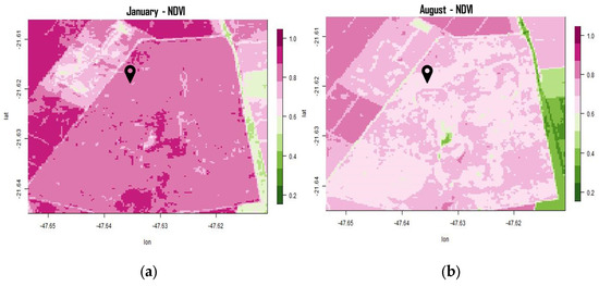 Temporal average NDVI between 2013 and 2020, tower location under marked black pin, for the months of (a) January and (b) August.