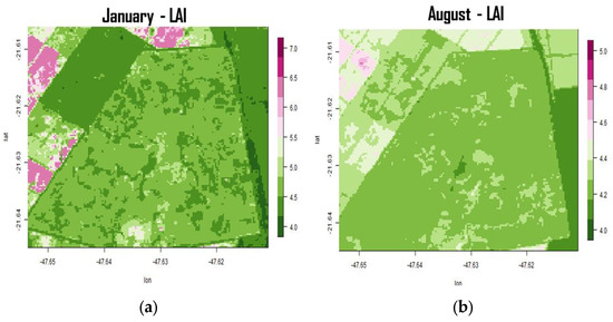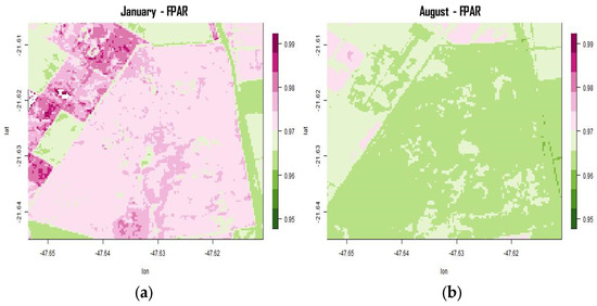 Similarly, the averaged LAI (Figure 4) and FPAR (Figure 5) in summer and winter also showed modest but significant seasonal variation. In the total area covered with Cerrado, the LAI varied from approximately 4.60 m2/m2 in January to 4.25 m2/m2 in winter, as shown in Figure 4b. The FPAR parameter also varied in the same direction, from approximately 0.975 in January to 0.955 in August. The seasonality of vegetation in the site was already noticed in situ, with increasing litterfall during the dry season [34]. The leaf fraction, the most important component of litter, is extremely sensitive to meteorological variables such as precipitation, humidity and air temperature, that are possibly associated to structural changes of the canopy [20].