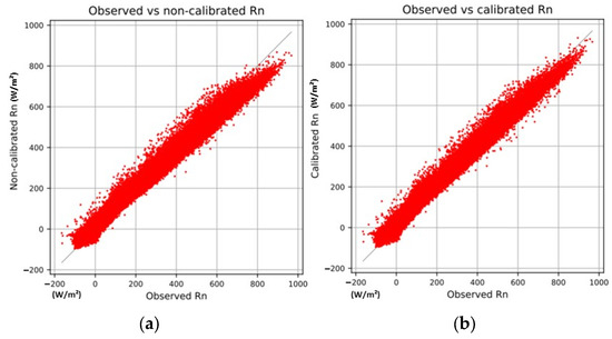 Observed and calculated net radiation (Rn) by the SiB2 model using (a) default initial parameter values; (b) optimized parameter values. RMSE varied from 72.8 to 66.7, and Nash–Sutcliffe efficiency coefficient (NSE) ranged from 0.72 to 0.76 in the initial and optimized cases, respectively.