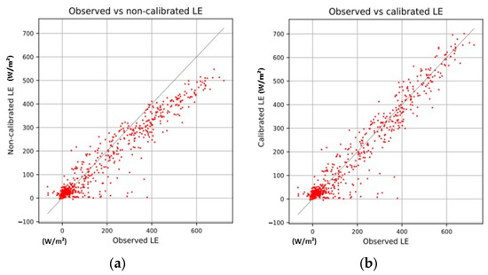 The calibration of optical parameters with optimization of the net radiation (Rn) used data in the time interval from 2010 to 2017 and was performed simultaneously for 11 parameters (Table 2). For the LE flux, the optimization was performed in the summer months from January to March, and in the winter months from June to August, to accommodate the seasonality of the optimized parameters and the soil moisture initialization in the year 2011 with selected days without precipitation. The optimized parameters of slope of photosynthetic conductance, average leaf time projection and green fraction of the canopy were interpolated for the other months of the year. The improvement in performance with calibration was quite adequate for Rn (Figure 6) and LE (Figure 7).