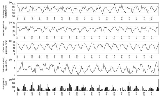 Monthly average of field measurements at the PEG Cerrado tower for the years 2001–2019: (a) incoming solar radiation (W m−2); (b) air temperature (°C); (c) water vapor pressure (hPa); (d) horizontal wind speed (m/s); and (e) precipitation (mm/month).