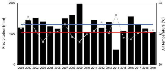 Average annual air temperature (°C) (dashed line), precipitation (mm) (bars) and mean temperature (red line) at the PEG site for the years 2001–2019. The climatological normal of precipitation is shown with the blue line.