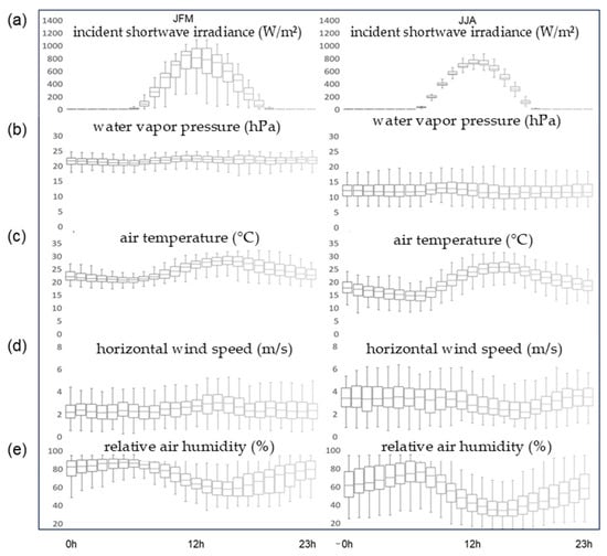 We also noted a pronounced variability in the mean diurnal cycle and concurrent with seasonality, based on the comparison of the hot/wet months January–February–March (JFM) and the cold/dry months July–August–September (JJA) (Figure 10). In JFM, the incoming solar radiation (Figure 10a) was higher, caused by higher elevation angle compared to JJA and by the greater hourly variability due to the presence of cloudiness.