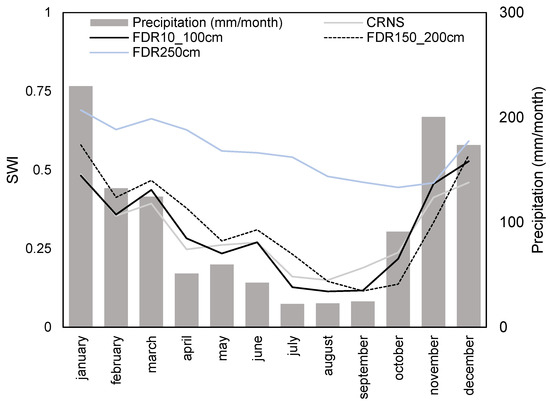 Mean monthly precipitation (mm) and soil water index (SWI) for CRNS and FDR for the averaged layer, including levels 10, 20, 50, 80 and 100 cm (black line) (referred to as FDR10_100 cm); levels 150 and 200 cm (black dashed line) (referred to as FDR150_200 cm); and at 250 cm (light blue line), calculated over the common data range at the PEG site.