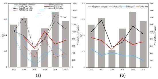 Annual precipitation (bars) in mm/year, and mean SWI measured at the PEG site, estimated for three ranges of the year: January–February–March (JFM—solid and dotted black lines), July–August–September (JAS—solid and dotted blue lines) and October–November (ON—solid and dotted red lines), for (a) FDR measurements, including depths from 10 to 100 cm, from 150 to 200 cm, and (b) CRNS measurements.
