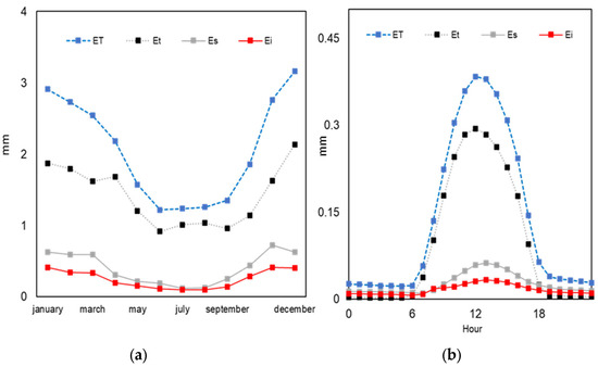 (a) Monthly and (b) hourly evapotranspiration (ET), Et (transpiration), Es (soil evaporation) and Ei (interception loss of rainfall), calculated by the SIB2 model for PEG, averaged for the years 2011–2019.