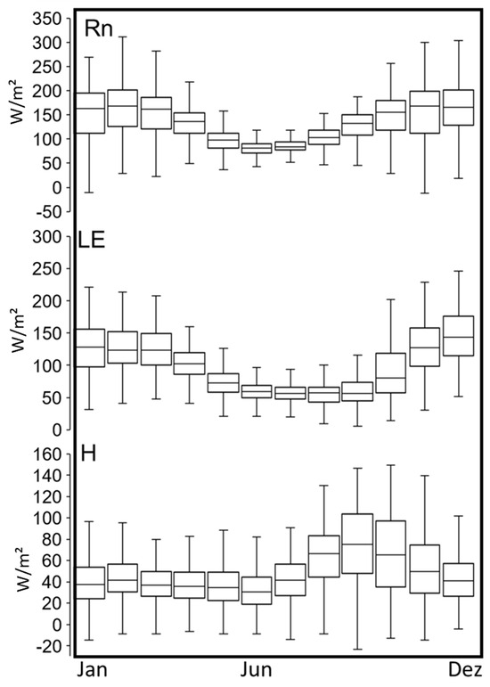 During the hottest and most humid months, net radiation was higher due to increased global solar radiation. Combined with greater soil moisture, this resulted in a higher latent heat flux. A variation in the median LE was observed around 125 W/m2, with a wide range of intra-month variance. Additionally, during this period, the H flux tended to be lower throughout the year (Figure 14).