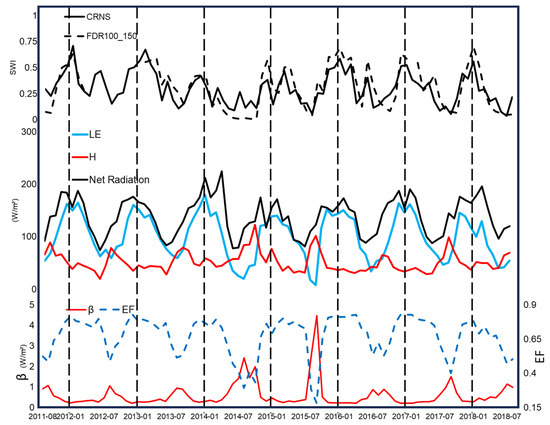 Monthly mean of soil wetness index (SWI) of FDR100_150 cm (deep) and CRNS (shallow) (in top); net radiation (black line in middle), latent heat flux (LE) (blue line in middle), sensible heat flux (H) (red line in middle), Bowen ratio (β) and evaporative fraction (EF) (red and dashed blue lines in bottom) for the PEG site during the range from 2011 to 2018.
