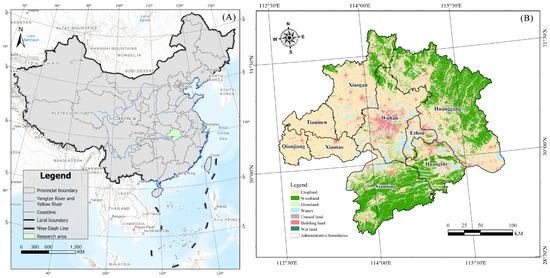 This study selects the WHUA as the research area. The WHUA mainly includes nine cities, including Wuhan City and its surrounding areas, such as Huangshi, Huanggang, Xiaogan, Xianning, and Qianjiang. The total area of the WHUA is 57,800 km² (Figure 1) [47]. The region belongs to a subtropical monsoon climate, characterized by hot summers. At the same time, the region has experienced rapid development in recent years, with a large population and industries concentrated in this area, posing significant challenges for its future development [48].