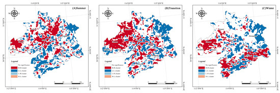 Spatial clustering map of the LST for the different seasons in the WHUA: (A) summer, (B) transition, and (C) winter.