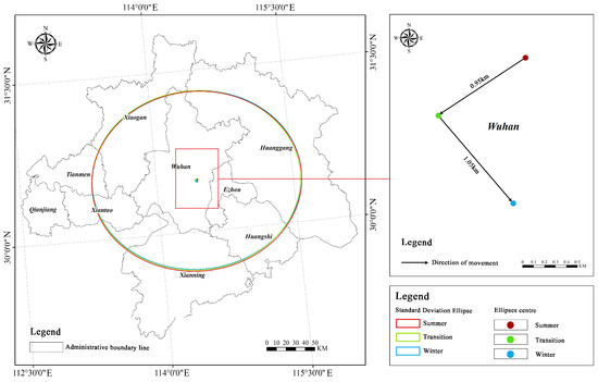 Regarding its trend, this study analyzed the spatial variation trends of the LST during different seasons using SDE analysis (Table 2). As depicted in Figure 6, the centripetal features of the LST in the WHUA are not pronounced, but a predominant “southwest-northeast” trend can still be discerned. Considering the variation trends across different seasons, it can be observed that the minor axis gradually increases starting from the summer, indicating a weakening clustering tendency of the LST. Examining the flatness, it shows a trend of initially decreasing and then increasing from summer, suggesting a gradual decrease in the directionality of the LST starting from summer, and gradually increasing by winter. Considering the change in the central point, from summer to transition, the LST center moved southwestward by 0.95 km, indicating a slight increase in the LST in the southwest of the WHUA. From transition to winter, the LST center shifted southeastward by 1.05 km, indicating a certain increase in the LST in the southeast part of the WHUA during winter.