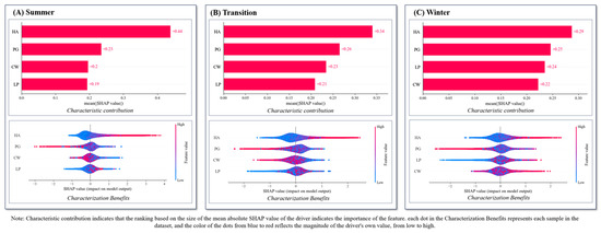 In terms of the contribution of the driving factors, based on the mean |SHAP value|, the impact of the different driving factors on the LST can be observed. Overall, the influence of each driving factor on the LST is higher in summer than in the transition and winter, with the transition being slightly higher than winter. When considering individual driving factors, HA plays a dominant role in all the seasons, with its effect being most significant in summer and relatively weaker in the transition and winter. Following HA, PG also exhibits a noticeable advantage in influencing the LST, with its effect being most pronounced in the transition, followed by winter, and relatively weaker in summer. CW and PG show relatively consistent variations in their effects across different seasons, peaking in the transition and reaching the minimum in summer. LP reaches its maximum impact in winter and its minimum impact in summer.