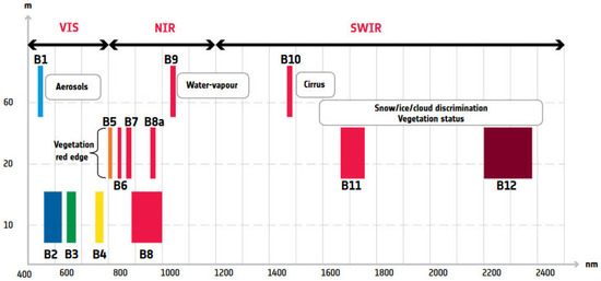 The Sentinel-2 twin satellite constellation (Sentinel-2 A/B), provides MS image data in the V-NIR and SWIR wavelengths, providing global Earth coverage with a 5-day revisit period [32]. Among the 13 bands of Sentinel-2 A/B, whose layout is shown in Figure 1, the VNIR bands, specifically B2, B3, B4, and B8, have the highest spatial resolution and a ground sampling distance of 10 m (GSD). B5, B6, and B7, in the red edge (RE) region, B11 and B12, in the SWIR region, and B8a, a narrowband near-infrared (NIR) centered at 865 nm, are provided at an intermediate resolution of 20 m GSD. The three lower-resolution bands available at 60 m GSD, B1, B9, and B10, are less relevant for EO and are used mainly for atmospheric studies, to recover the content of coastal aerosols, water vapor, and cloud ice, respectively. The difference in spatial resolutions is a consequence of the fundamental trade-off in the design of electro-optical systems between spatial resolution, spectral resolution, and radiometric sensitivity [33]. Enhancing the resolution of MS data sets is generally performed thanks to the availability of a panchromatic image, using multiresolution analysis [34].
