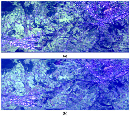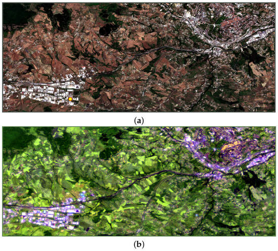 We have identified three test locations to collect Sentinel-2 L1C and L2A data, with simultaneous availability of aerosol data from an AERONET ground station. A 148 km2 area near the city of Potenza, Italy, was selected as the first test site that included the AERONET sun photometer located at 40.60° N, 15.72° E, and 770 m elevation. Sentinel-2 L1C and L2A images—with the lower-resolution bands bicubically resampled at 10 m GSD—acquired on 6 June 2021, have been collected as a clear-sky reference (AOD < 0.07 measured by the AERONET ground station). Note that a single clear-sky reference date is required to calculate the spectral index for aerosol characterization, as described in Section 2.4.2. A 90-km2 portion of the scene is shown in Figure 2, using two color compositions of the surface reflectance of the reference acquisition, i.e., true color (B4-B3-B2) and false color (B12-B11-B1). Two other L1C acquisitions over the same area have been downloaded for testing: one taken on 26 July 2020, to prove the capability of recognizing low aerosol depth, and the other taken on 10 August 2021 as an example of a moderate Saharan dust aerosol event. The true and false color compositions are shown in Figure 3 and Figure 4.