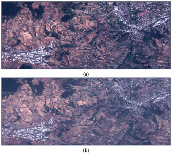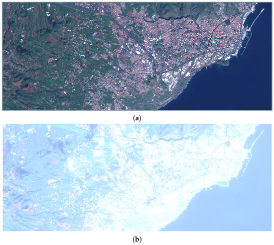Some 90 km2 portions of Potenza Sentinel-2 TOA reflectance B4-B3-B2 color compositions: (a) clear sky, 26 July 2020; (b) dust event, 10 August 2021.