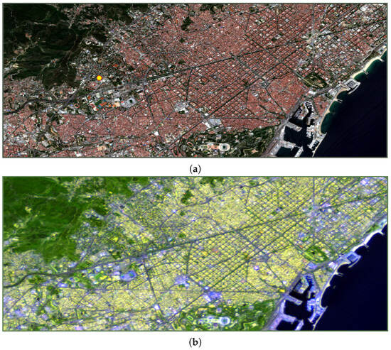Some 90 km2 portions of B4-B3-B2 (a) and B12-B11-B1 (b) color compositions of Sentinel-2 surface reflectance of the 22 May 2020 Barcelona reference acquisition. The yellow circle in (a) indicates the AERONET instrument position.