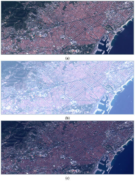 Some 90 km2 portions of Barcelona Sentinel-2 TOA reflectance B4-B3-B2 color compositions: (a), clear sky, 27 May 2020; (b), dust event, 21 July 2022; (c), biomass burning event, 25 October 2020.