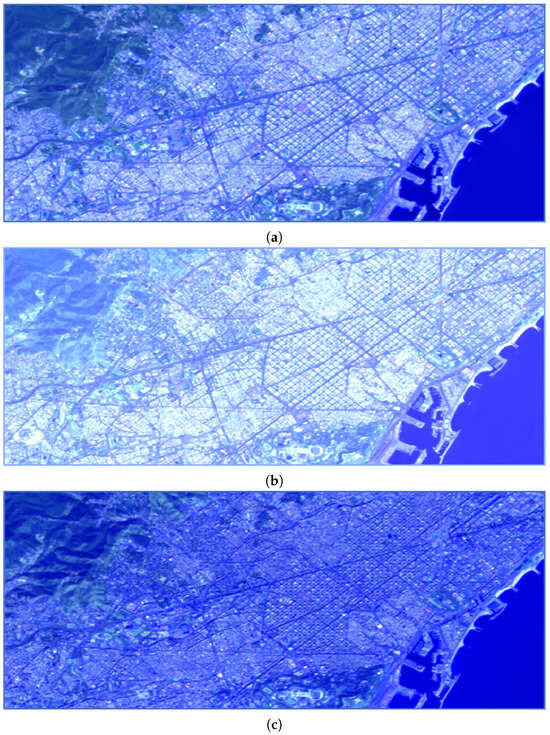 Some 90 km2 portions of Barcelona Sentinel-2 DBB maps (a), clear sky, 27 May 2020; (b), dust event, 21 July 2022; (c), biomass burning event, 25 October 2020.