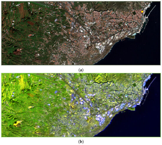 Some 90 km2 portions of Tenerife Sentinel-2 TOA reflectance B12-B11-B1 color compositions: (a) clear sky, 14 February 2021; (b) extreme dust event, 30 January 2022.