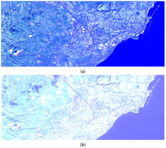 A second test site has been considered in a Barcelona metropolitan area, Spain, where an AERONET station is present at 41.39° N, 2.11° E and 125 m elevation. We have collected Sentinel-2 images on a 243 km2 region that includes urban, vegetated, and sea areas. The clear sky reference acquisition (Figure 5) was taken on 22 May 2020. The other three L1Ca 41.39° N, 2.11°. The same area has been downloaded for testing: the first was taken on 27 May 2020 to prove the capability of recognizing low aerosol depth, the second was taken on 21 July 2021 as an example of a Saharan dust aerosol event, and the third acquisition was made on 25 October 2020 corresponding to a biomass burning event. The compositions of the true and false colors in the same 90 km2 detail are shown in Figure 6 and Figure 7.