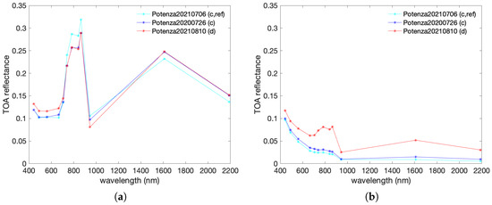 Remote sensing optical data are available in spectral radiance (radiance normalized to the width of the spectral interval of the instrument) and reflectance formats. The reflectance, which is implicitly spectral, ranges in [0, 1] and can be defined as top-of-atmosphere (TOA) reflectance or as surface reflectance [35]. The former is the surface spectrum as viewed through the atmosphere by the satellite; it is given by the TOA spectral radiance rescaled by the TOA spectral irradiance of the Sun. The latter represents the spectral signature of the imaged surface; its determination requires the estimation, by parametric modeling and/or measurements, of the upward and downward transmission coefficients of the atmosphere and of the upward scattered radiance at TOA, a.k.a., the path radiance [36]. In addition to TOA spectral radiance, which is a level-one product (L1), the TOA reflectance, the L1C product, is generally available for systems featuring a nadir acquisition and global Earth coverage, such as Landsat 7 Enhanced Thematic Mapper Plus (ETM+), LandSat 8-9 Operational Land Imager (OLI), and Sentinel-2 A/B [37]. Surface reflectance is a level-two product (L2A) and is also distributed for global coverage systems. Sentinel-2 L1C and L2A products are available free online from ESA.