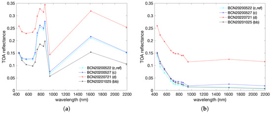 Barcelona: TOA reflectance spectra (a) averaged over land and (b) over water pixels, for clear-sky reference (c, ref), almost clear sky (c), dust (d) and biomass burning (bb) events.
