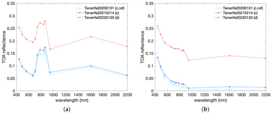 Some 90 km2 portions of Tenerife Sentinel-2 TOA reflectance B4-B3-B2 color compositions: (a) clear sky, 14 February 2021; (b) extreme dust event, 30 January 2022.