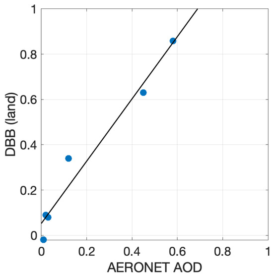 Scatterplot of average DBB values on land pixels versus AERONET coarse mode AOD measures (second and left column of Table 2). The three clear sky reference cases of DBB and the burning event in the last row have been discarded. The fit of the measures to the superimposed regression line is .