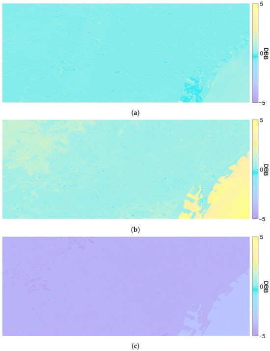 The Barcelona test site contains three cases: low aerosol loading, identified as dust by the index, consistent dust, and considerable burning biomass. The related maps of DBB are shown in the three panels of Figure 15. It is immediately apparent in all three maps that water pixels display a surprising level of aerosols, in contrast to the land, due to the significant and unpredictable alteration in the sea’s surface reflectance on the event date compared to the reference clear sky date. In fact, the color of the sea is the reflection of atmosphere, which does not contain aerosols in the clear sky reference. The normalizing term in Equation (1), specifically introduced to remove the underlying texture from the aerosol map, should not change between the event and the reference dates. This is true only in an urban context, but definitely false over water and, in part on the vegetated region surrounding the outskirts, clearly visible in the map of Figure 15b. Thus, the index is more accurate, where the surface reflectance remains unchanged over time. This is the reason why the texture of the city cannot be perceived on the maps of DBB.