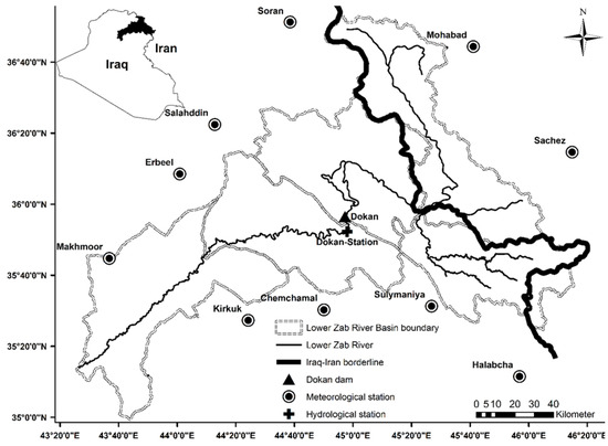 The Lower Zab River (between latitudes 36°50′ N and 35°20′ N and longitudes 43°25′ E and 45°50′ E) is one of the mainly significant branches of the Tigris River [2,22]; Figure 1. The river is situated nearly 220 km north of Baghdad, the capital city [2,22,23]. The corresponding catchment is approximately 19,254 km2 [24].