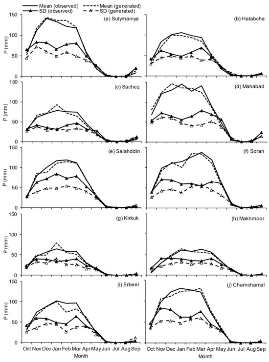 Figure 3. Comparison between observed monthly (mean and standard deviation (SD)) precipitation (P) and the corresponding values generated by LARS-WG7 at each meteorological station within the studied basin for the period 1980–2010.