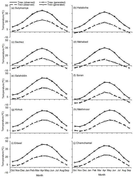 Figure 4. Comparison between the observed mean monthly (maximum (Tmin) and minimum (Tmax) temperatures and the corresponding values generated by LARS-WG7 at each meteorological station within the studied basin for the period 1980–2010.