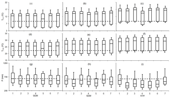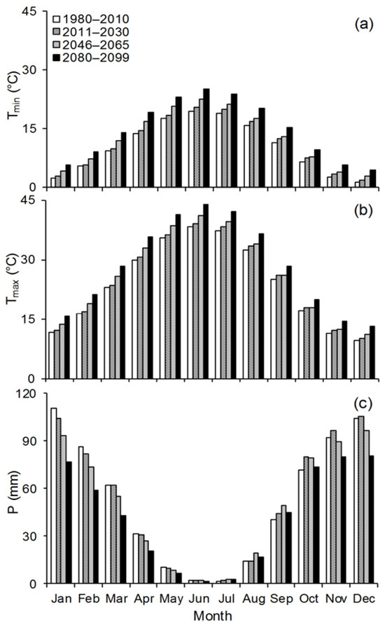 Figure 5. Values of the monthly means of the minimum and maximum air temperature and precipitation (a) Tmin; (b) Tmax; (c) P, respectively, during the 1980–2010, 2010–2030, 2046–2065, and 2080–2099 period, downscaled by seven assembly general circulation models (GCMs).