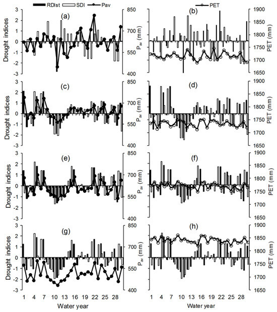 Figure 7. Temporal variations of RDIst (the annual standardized reconnaissance drought index) and SDI (annual streamflow index) linked with Pav (the long-term mean basin precipitation) (left graphs) and PET (potential evapotranspiration) (right graphs) for: (a,b) 1980–2010; (c,d) 2011–2030; (e,f) 2046–2065; and (g,h) 2080–2099 time horizon, respectively, over the representative basin.