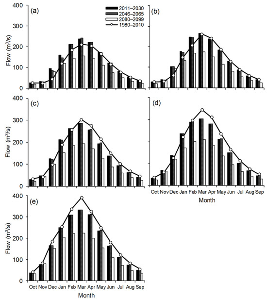 Figure 8. Relationship linking the baseline with the climate change scenario for the monthly (a) 10th; (b) 25th; (c) 50th; (d) 75th; and (e) 90th percentiles.