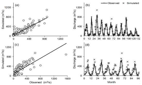 Figure 9. Observations compared to the simulated streamflow time series using the Hydrologiska Byråns Vattenbalansavdelning model for (a,b) calibration periods (1988/1989–1999/2000) and (c,d) validation periods (1979/1980–1986/1987), respectively. Note: The solid line in (a,c) is a 45° line, representing what would be a perfect correspondence between observed data and solution values, the circle point.