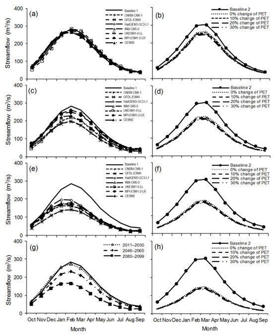 Figure 10 presents temporal variations of the mean streamflow modeled by climate variables, estimated through GCM, and downscaled by LARS-WG7 (Figure 10a,c,e,g, left figures) and DP (Figure 10b,d,f,h, right figures) scenarios, respectively. To prevent any tendency caused by the rainfall–runoff model procedure, streamflow values for baseline 1 (1980–2010) and baseline 2 (1988–2000) correspond to the simulated values. The outcomes show how climate change is likely to lead to a reduction in reservoir inflow.