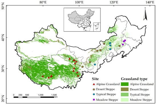 The study primarily focuses on the grasslands of Northern China (Figure 1), located on the eastern flank of the Eurasian grassland. It is mainly composed of temperate grasslands, which are continuously distributed across the Inner Mongolian Plateau, with a total area of approximately 3 × 108 hm2, accounting for over 85% of the total area of natural grasslands in China, making it the main body of natural grasslands in China. The region includes various types such as temperate meadow steppe, temperate typical steppe, temperate desert steppe, and alpine grassland [].