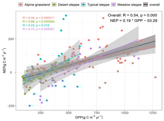 Relationship between NEP and GPP of different grassland ecosystems in Northern China.