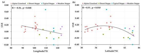 (a) Relationship between the CUE and longitude. (b) Relationship between the CUE and latitude.