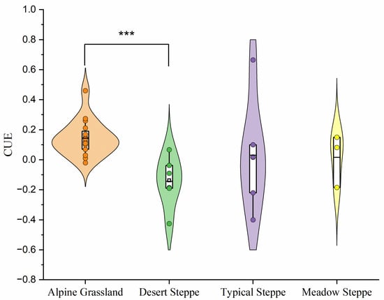 The differences in CUE among different grassland ecosystems in Northern China. The solid line within the box represents the mean value. *** represents p < 0.001.