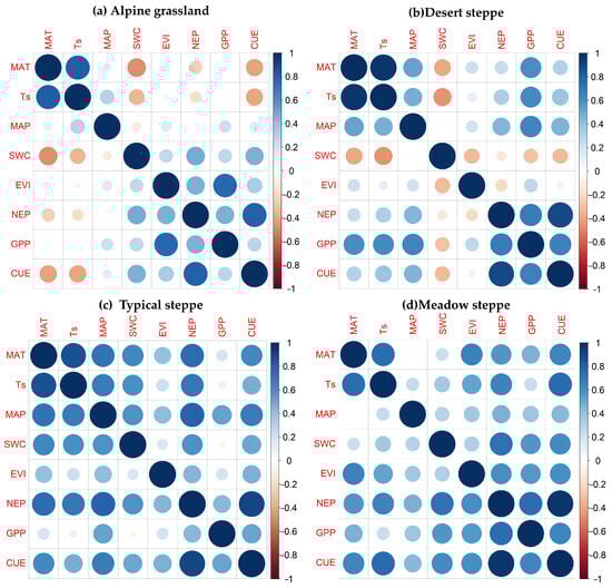 The Pearson correlation analysis between CUE and influencing factors for different grassland types is shown in Figure 5. Biological factors exert a positive impact on grassland CUE, and NEP emerges as the most significant factor influencing CUE in Northern China. Environmental factors exhibit varying effects on CUE across different grassland types. Temperature positively influences CUE in desert steppes, typical steppes, and meadow steppes but negatively impacts CUE in alpine grassland. Compared to temperature and MAP, SWC emerges as a major factor affecting CUE in grasslands, positively impacting CUE in alpine grassland, typical steppes, and meadow steppes while negatively impacting CUE in desert steppes.