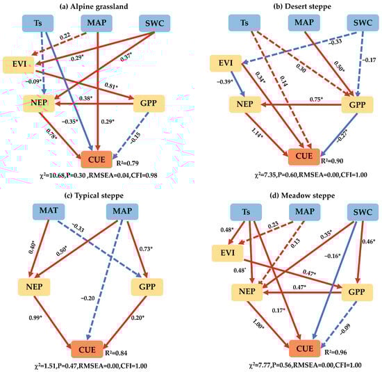 Structural equation modeling explores the direct and indirect effects of different factors on the CUE of various grassland ecosystems. The blue and red arrows represent negative and positive effects, respectively. The dashed lines denote insignificant relationships (p > 0.05). The numbers beside the lines represent standardized path coefficients. * indicate significance level less than 0.05.