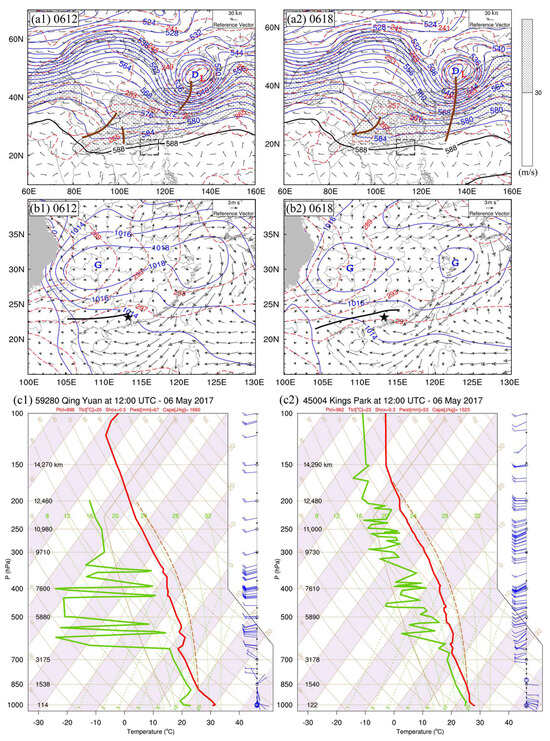 (a1,a2) Geopotential height (blue solid contours, dagpm), the western Pacific subtropical high (black contours, dagpm), temperature field (red dash contours, K), wind field (wind barbs, m s−1), trough line (brown solid line) at 500 hPa, and high-level jet at 200 hPa (dotted, m s−1); (b1,b2) sea level pressure (blue solid contours, hPa), surface temperature field (red dashed contours, K), 10 m wind (arrows, m s−1), surface shear line (black solid line); (c1)vertical profiles plotted on skew T-lgp diagram of the state curve (red dashed line), stratification curve (red solid line), dew point curve (green line), and wind field (blue wind barbs) at Qing Yuan sounding station (ID59280) in Guangdong Province and (c2) same as (c1) but for King’s Park sounding station (ID45004) in Hong Kong at 1200 UTC, 6 May 2017. (a1,b1) 1200 UTC, 6 May 2017; (a2,b2) 1800 UTC, 6 May 2017. Blue letter “G” (“D”) and red letter “L” denote the centers of high (low)-pressure systems and warm (cold) air, respectively. The dashed black rectangle denotes the position of Guangdong Province. The black pentagram denotes the position of Guangzhou City.