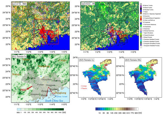 The two simulations incorporate the GlobeLand30 dataset and the WRF default MODIS LC data for the Guangzhou 5·7 case, respectively. The simulations with MODIS 30-arc second LC are henceforth denoted as CTL_900, and the simulations with GlobeLand30 LC are denoted as GLC_30. Considering the rapid urbanization in China, the newest WRF default 30-arc second MODIS data (2001–2010) instead of the USGS 30-arc second LC (1993) is applied to reduce simulation bias []. The GlobeLand30 dataset, which has 10 LC categories, was created using 30 m multispectral satellite images, including Landsat series’ TM5, ETM+, OLI and China’s HJ-1, in 2010. It is often recognized as significant LC data with higher resolution and classification accuracy and latest urban information []. To make the GlobeLand30 LC compatible with WRF Pre-processing System (WPS), they are reclassified as the MODIS categories (20 land use categories, [] (Table 1)) and re-projected to the World Geodetic Coordinate System 1984 (WGS84). Figure 2(a1–b2) show the differences between the GLC_30 and the CTL_900 LC, while the patterns of urban areas, croplands, forests, and water are very different because of different spatial resolutions and original classification standards. Obviously, the CTL_900 LC has overestimated urban areas and agricultural lands. It only has one kind of forest category, which is why the GlobeLand30 looks very green. To keep the topography consistent with the LC in WRF model, we also introduced the 30 m high-resolution topography dataset (Figure 2(b1)) in both of the two experiments. We used the 30 m high-resolution topography to increase the sensitivity of WRF model to surface heterogeneity of domain area, especially trumpet-shaped mountain areas in PRD. It is one of key factors to simulate the convective initiation well.