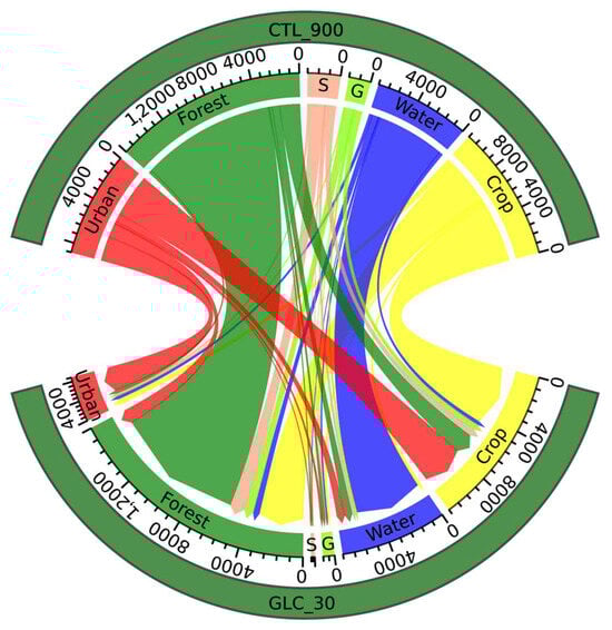 Six main types of LULC transitions between CTL_900 and GLC_30 (in km2) within the red box area in Figure 2(a1,a2) (112.5 E–114.5 E, 22 N–24 N). S represents shrublands and savannas; G represents grasslands.