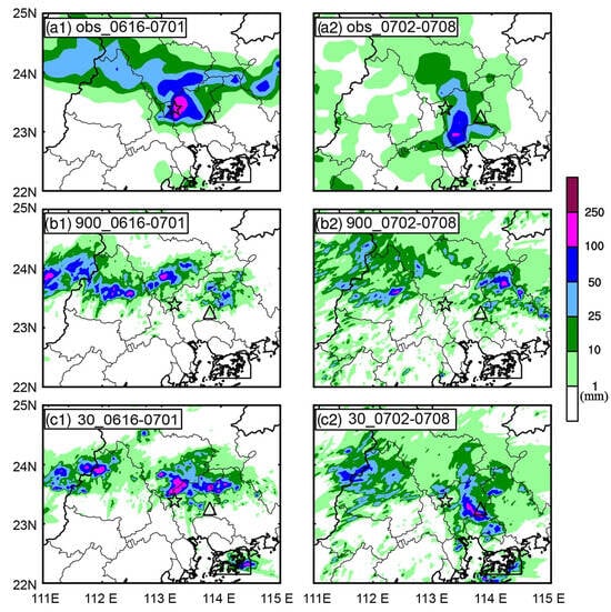 Observed and simulated accumulative precipitation (shaded, mm). The pentagram denotes Huadu, and the triangle denotes Zengcheng: (a1,a2) observed; (b1,b2) CTL_900; (c1,c2) GLC_30; (a1–c1) Stage 1: from 1600 UTC on 6 May to 0100 UTC on 7 May 2017; (a2–c2) Stage 2: from 0100 to 0800 UTC on 7 May.