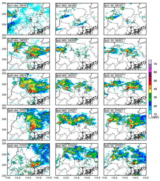 Observed and simulated composite radar echo (shaded, dBZ); The pentagram denotes Huadu, and the triangle denotes Zengcheng: (a1–a5) Observed; (b1–b5) CTL_900; (c1–c5) GLC_30. (a1–c1) 1600 UTC; (a2–c2) 2000 UTC; (a3–c3) 2300 UTC on 6 May 2017; (a4–c4) 0200 UTC; (a5–c5) 0500 UTC 7 on May 2017.